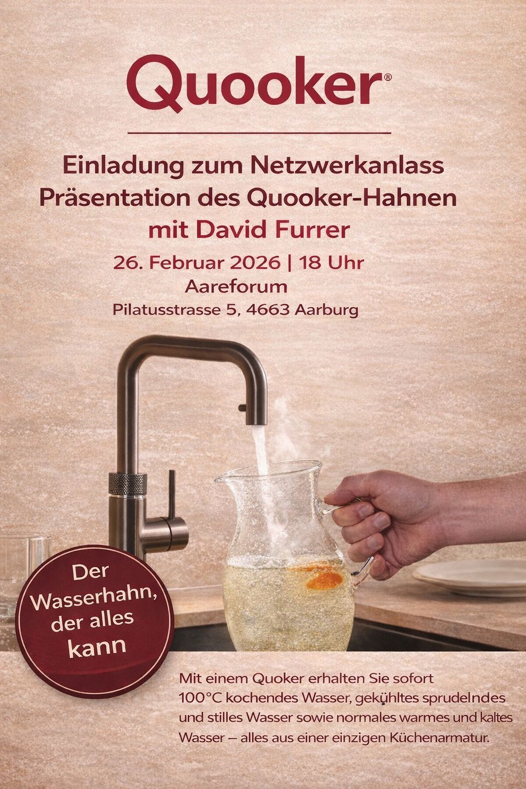 Am Donnerstag, 26. Februar 2026, findet im Aareforum Aarburg ein exklusiver Netzwerkanlass mit Quooker Präsentation statt. Mitglieder, Partner und Gäste sind herzlich eingeladen, innovative Küchentechnologie live zu erleben.